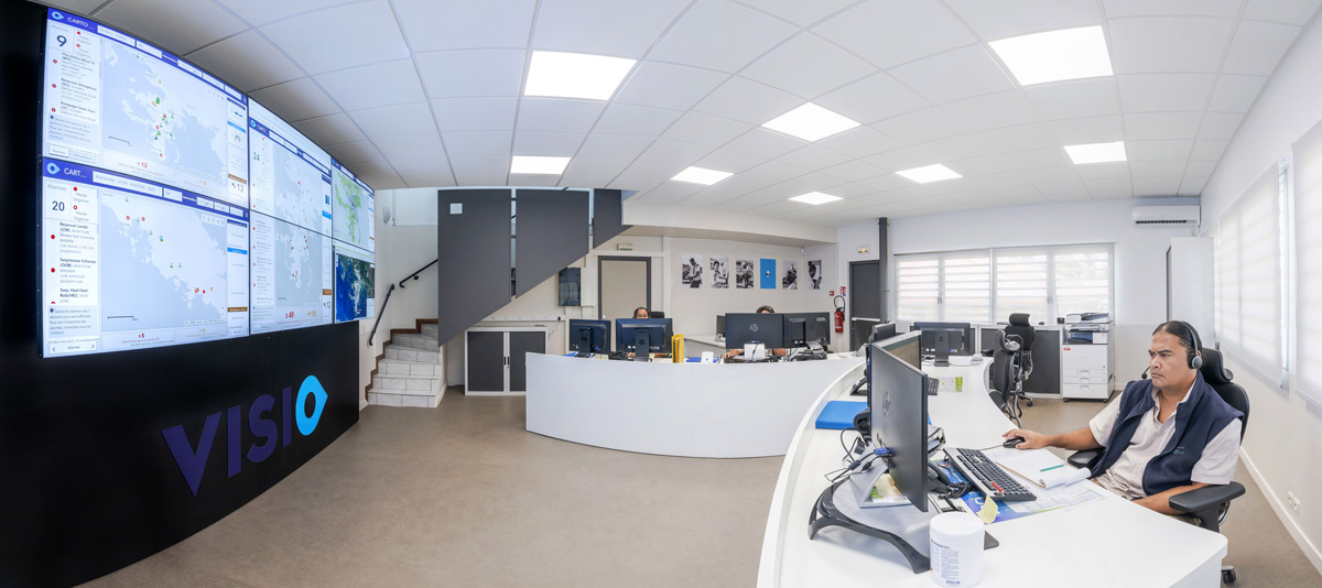 Implanté sur la commune de Païta, le centre VISIO est équipé d’un mur d’écrans affichant un module cartographique développé localement. Mise à jour en temps réel, cette cartographie permet aux exploitants de visualiser, sur un seul et même outil, le quotidien de leur exploitation : alarmes, interventions terrains, débits de nuit, réseaux et installations et autres données de reporting majeures.